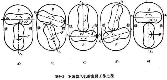 羅茨鼓風機系屬容積回轉鼓風機,其按轉子的形狀可分為兩葉型和三葉型。三葉型轉子每轉動一次由 兩 個轉子進行三 次吸、排氣。與二葉型相比,氣體脈動性小,振動也小,噪聲低.不問主要介紹一下二葉羅茨風機的工作原理。